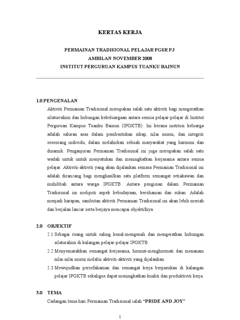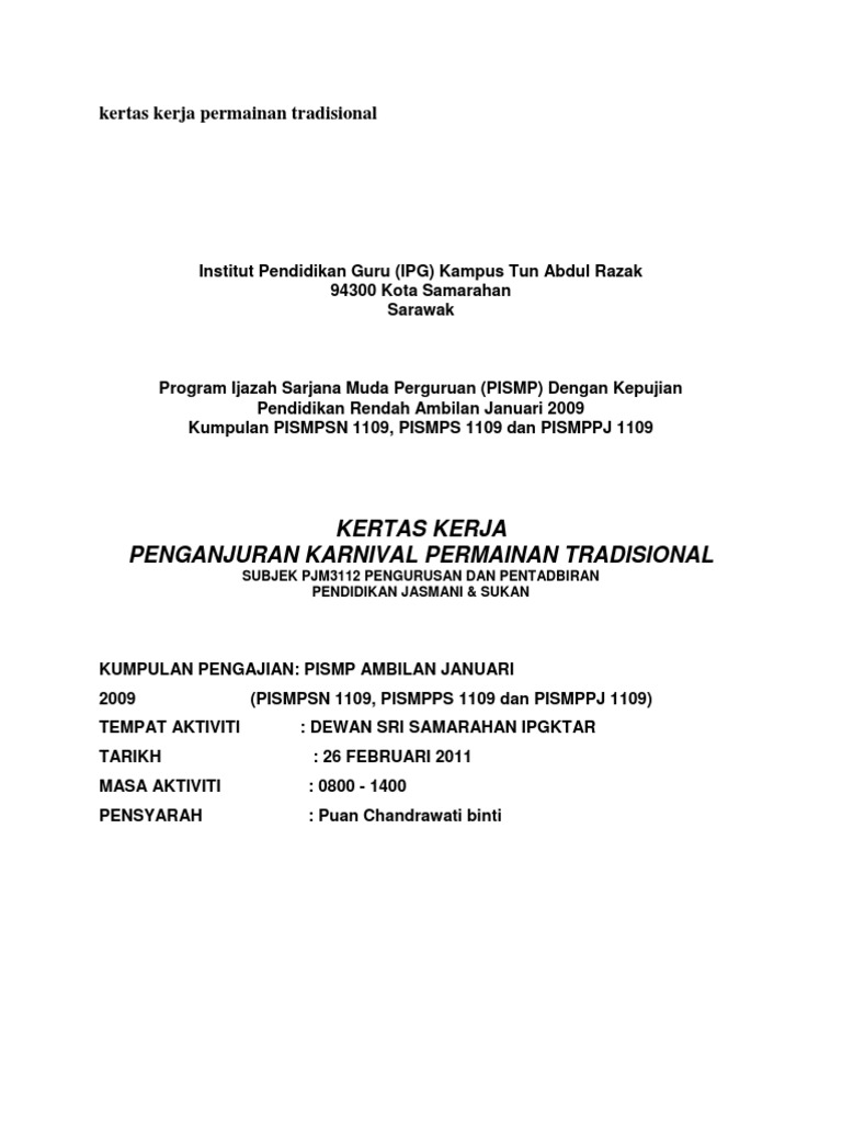 Kertas kerja pertandingan permainan tradisional tarikh. Kertas kerja KARNIVAL PERMAINAN TRADISIONAL GULI ANJURAN PERSATUAN GULI IPG KAMPUS PENDIDIKAN ISLAM DENGAN KERJASAMA JABATAN PENDIDIKAN JASMANI DAN. Kertas kerja pertandingan permainan tradisional peringkat institut pendidikan guru kampus sarawak 10 PENGENALAN Bagi memenuhi keperluan sukatan PJM 3112 Pengurusan dan.